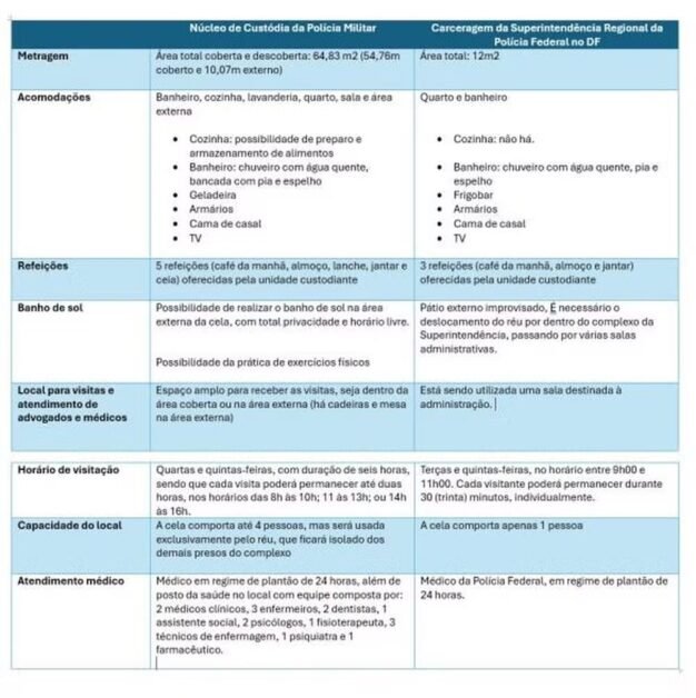 Na decisão sobre a transferência do ex-presidente Jair Bolsonaro (PL), o ministro Alexandre de Moraes, do Supremo Tribunal Federal (STF), incluiu um quadro que compara o local onde Bolsonaro estava, bem como será a nova cela. Ele terá mais espaço, assim como mais refeições e mais profissionais de saúde.