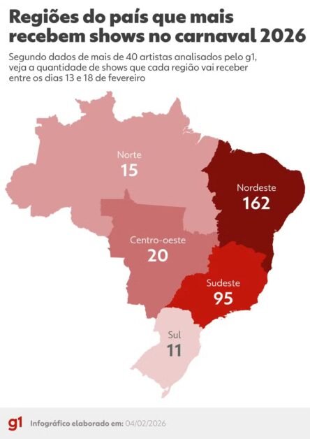 Somada a agenda dos artistas analisados no ranking, a região Nordeste recebe 53% dos shows do período. Destaque para Pernambuco, que vai receber 42 apresentações.