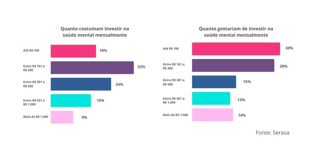 O levantamento aponta que apenas 18% afirmam destinar até R$ 100 por mês à saúde mental. Enquanto a maioria, 33%, aplicam entre R$ 101 e R$ 300. Esse cenário muda, porém, quando se trata de quanto os brasileiros gostariam de investir nesse cuidado.
