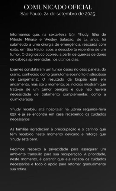 Além disso, Wesley Safadão também publicou o mesmo comunicado, afirmando que Yhudy está “recebendo os cuidados necessários”. “As famílias agradecem a preocupação e o carinho que têm recebido neste momento delicado e reforça que Yudhy está bem”, diz o texto.