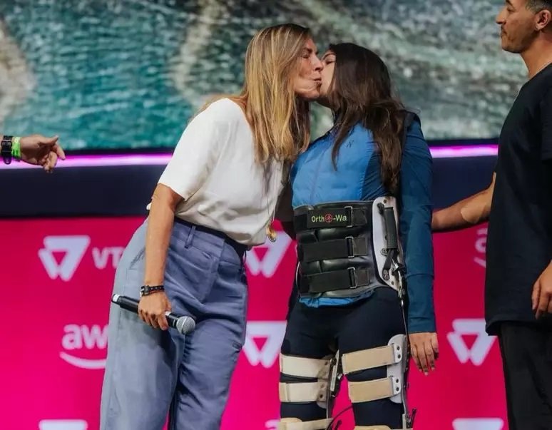 Para ficar em pé, a ex-atleta utilizou um dispositivo de tecnologia assistiva. Ela ficou tetraplégica após acidente sofrido durante um treino de esqui aéreo nos preparativos para os Jogos Olímpicos de Inverno, em 2014.