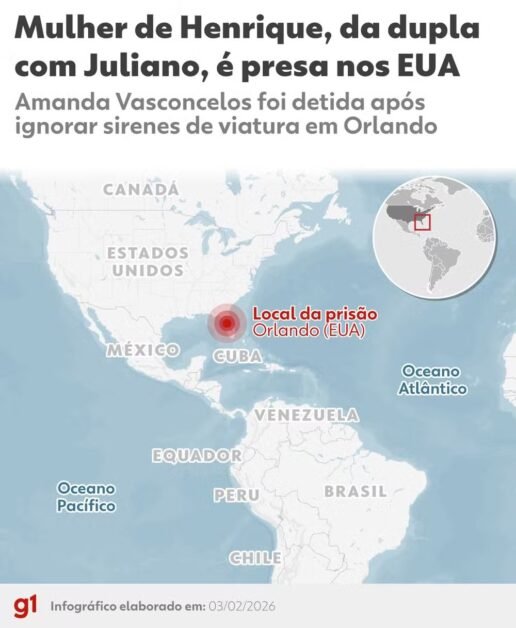 A empresária Amanda Vasconcelos Tavares Reis, de 28 anos, esposa do cantor sertanejo Henrique, que faz dupla com Juliano, foi presa em Orlando, na Flórida, por dirigir sem a carteira de habilitação válida. Dessa forma, ela passou a noite na prisão e vai passar por audiência na Justiça dos EUA.