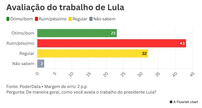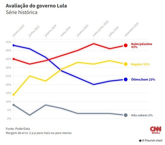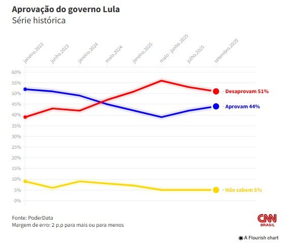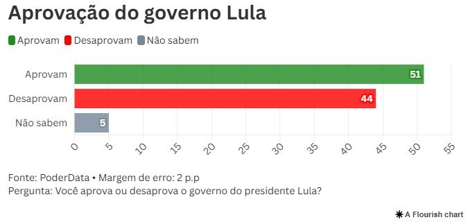 Conforme pesquisa PoderData divulgada nesta quarta-feira, 1 de outubro, 51% dos brasileiros desaprovam o governo do presidente Luiz Inácio Lula da Silva (PT). Assim sendo, o percentual oscilou para baixo, dentro da margem de erro, comparado ao último levantamento, divulgado em julho, quando era de 53%.